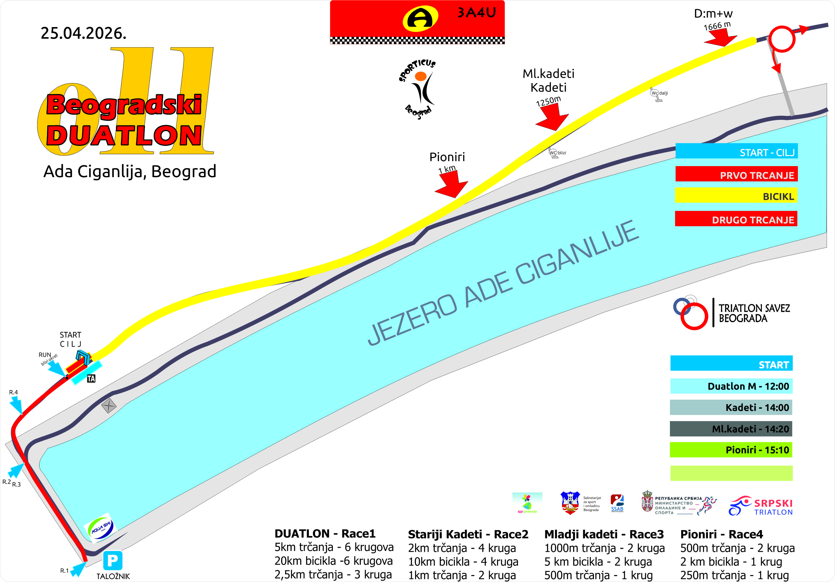 15:10 – Pioniri ž/m: 500m trčanja, 2km bicikla i 250m trčanja (2-1-1).